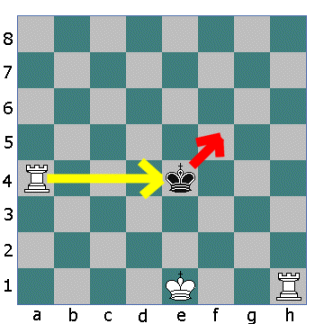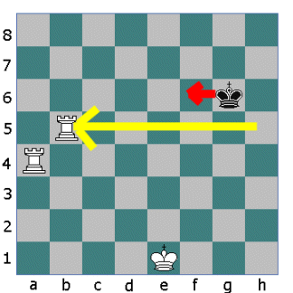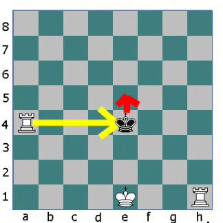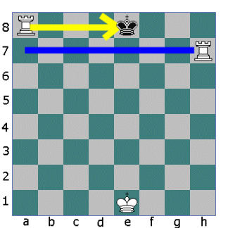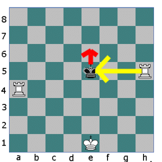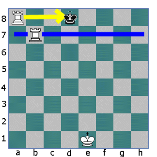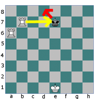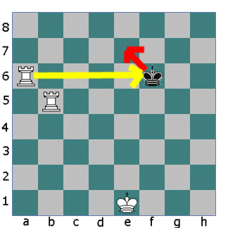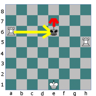 Now the other Rook opens fire. The King cannot move down the board into the fire of the first Rook. He cannot move sideways either so he must move up the board.