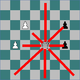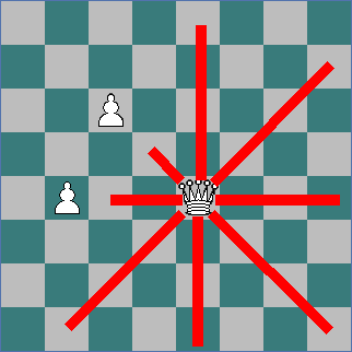 A Queen can be BLOCKED by a friendly piece. Here, the Queen CANNOT move onto or beyond the squares occupied by the White Pawns.