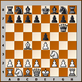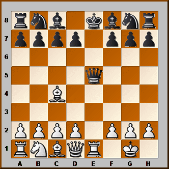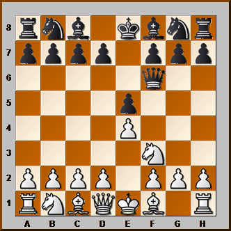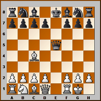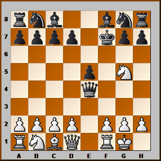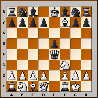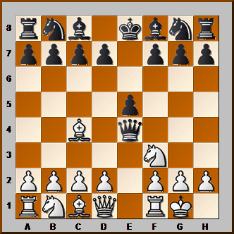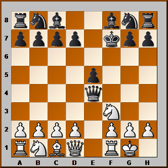 Black's usual move is Nb8-c6 but in this game he decides to DEFEND his Pawn with his Queen. He plays Qd8-f6. Not a good idea! ![]() |