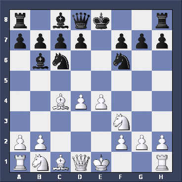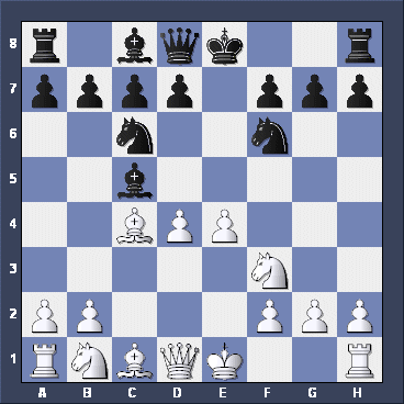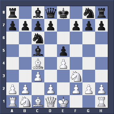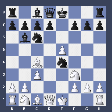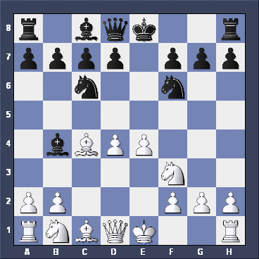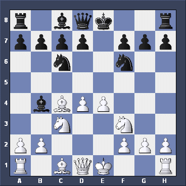 Black's usual, and best, reply is Ng8-f6, to THREATEN the Pawn on e4. White can play safe with d2-d3, but it's more exciting to advance the Pawn two squares, giving this position. ![]() |