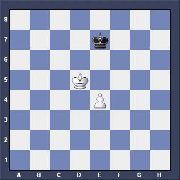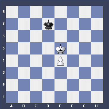 Correct! Now White's King will shepherd his pawn home. If you don't believe me, play it through for yourself from this position. Remember - if White's King gets to the side of the pawn, he'll win. ![]() |