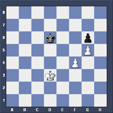 The winning move is indeed g5-g6, but the clever stuff happens next move. If Black plays f7xg6 we reach this position. How can White force a PAWN PROMOTION? ![]() ![]() ![]() ![]() ![]() ![]() |