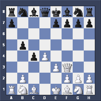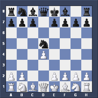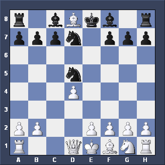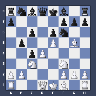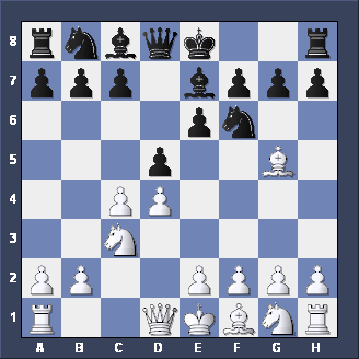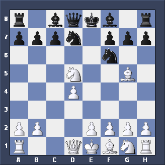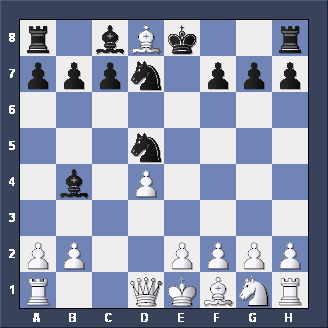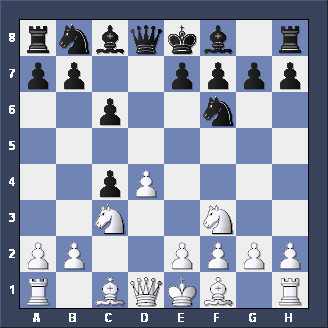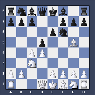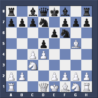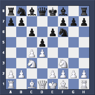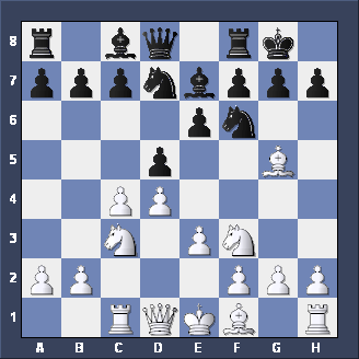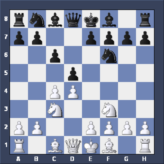 Play might continue like this: 5. Ng1-f3 0-0 6. e2-e3 Nb8-d7 7. Ra1-c1 ![]() |
